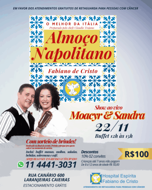 O melhor da Itália preparado pelo chefe Claudio Trajano, com show ao vivo com Moacyr & Sandra e sorteio de brindes*! Sábado 22/11Buffet 12h às 15h Adquira o seu ingresso antecipadoWhatsapp 11 4441-3031 Valor R$100Incluí: buffet massas, molhos, saladas, bebidas, sobremesa e café. Descontos10% 02 convitesCrianças até 7 anos não pagamDe 8 a 12 anos … Ler mais