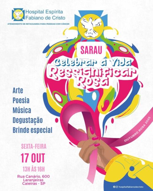 Na sexta-feira 17/10, vamos juntas viver uma tarde de arte, afeto e acolhimento no Sarau Celebrar a Vida: Ressignificar Rosa. Um espaço para compartilhar poesia, música, histórias e emoções, transformando cuidado em coletividade. 📅 Sexta-feira, 17/10Horário: 13h às 16h💰 Valor: gratuito📍 Local: Hospital Espírita Fabiano de CristoRua Canário 600 Laranjeiras – Caieiras/SP 📞 Mais informações: … Ler mais